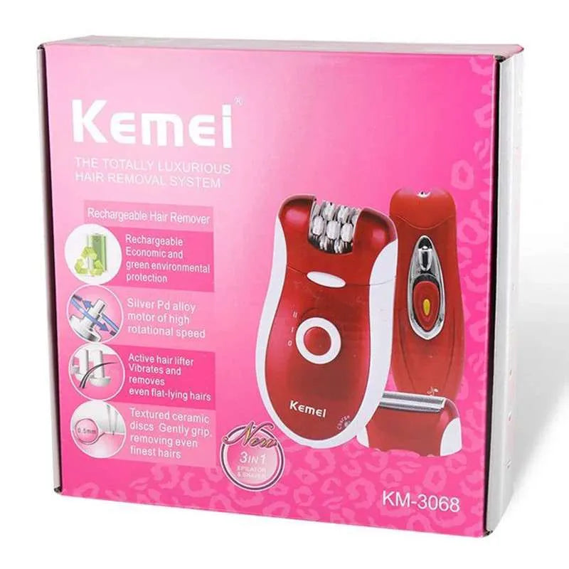 "Kemei KM-3068 3-in-1 shaver epilator for comprehensive grooming. Shaves, epilates, and trims for smooth, silky skin."
