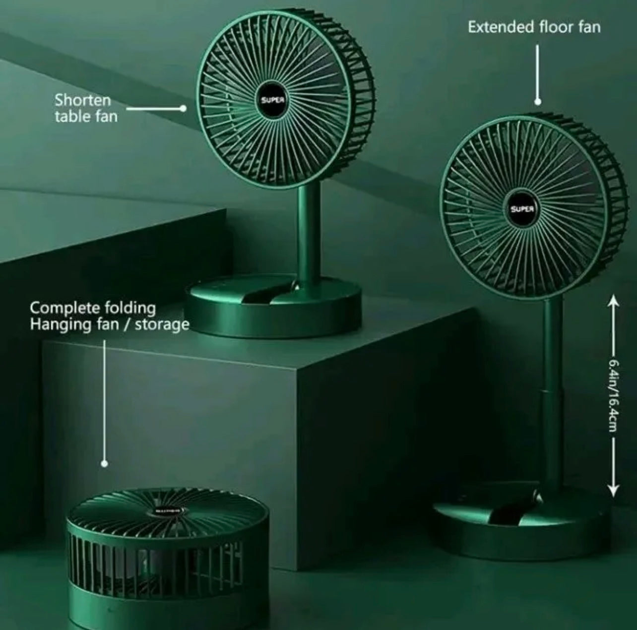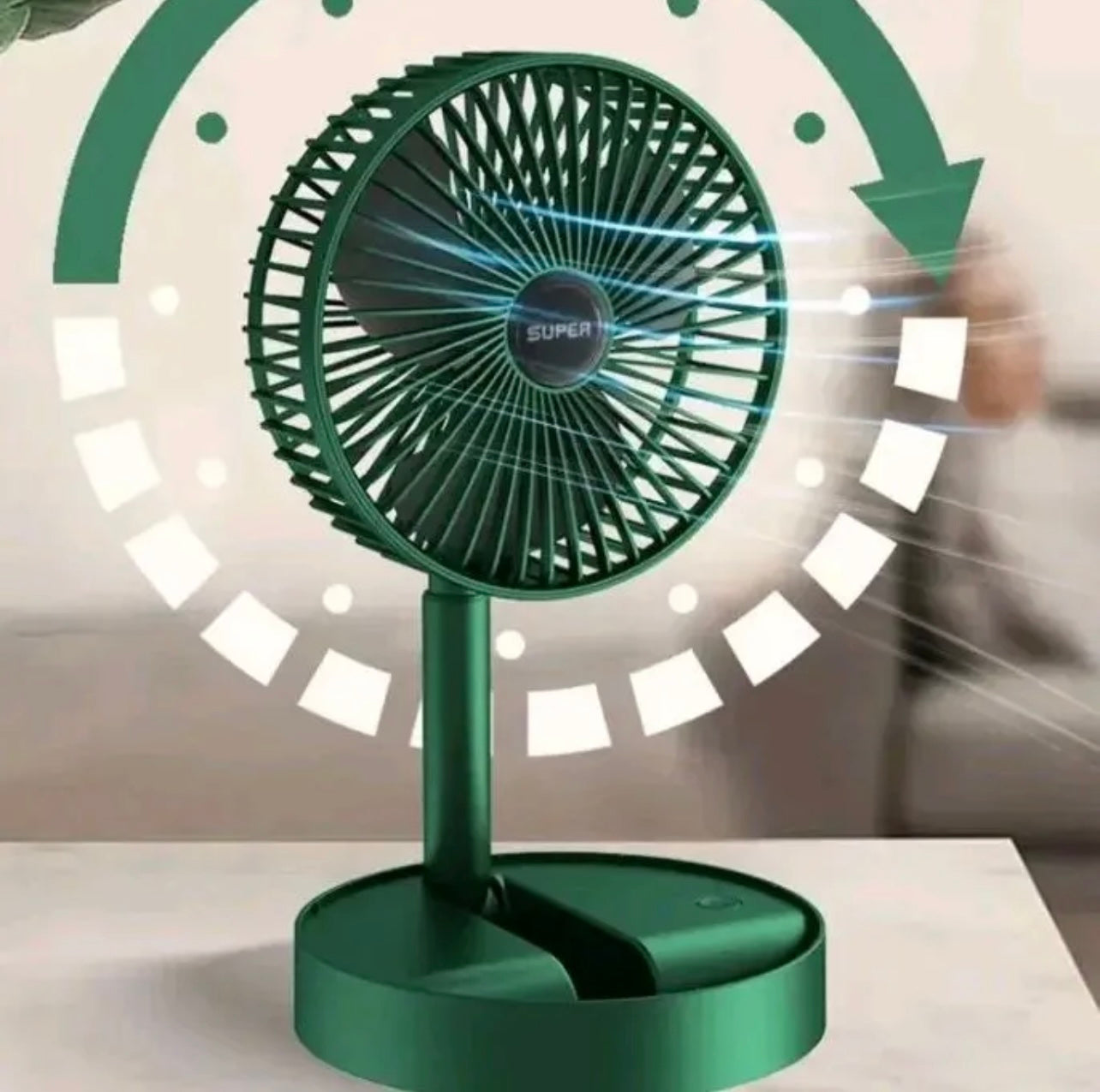"Rechargeable telescopic table fan for indoor and outdoor use. Adjustable and portable design for personalized comfort."